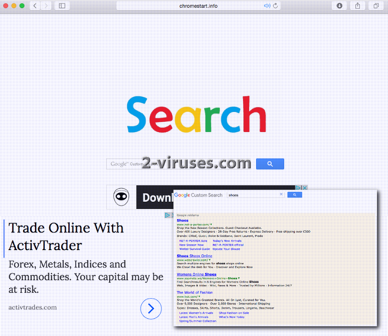 Vous devez accepter le fait que le virus ChromeStart.info favorise une plate-forme de recherche peu fiable. Les principaux drapeaux rouges qui sont facilement observables comprennent: cette installation de recherche ne fournit pas un document CLUF et une politique de confidentialité. Sans les termes d’utilisation de ChromeStart.info clairement indiqués, il est impossible de distinguer si vos séances vont être traitées de façon discrète. Si le virus ChromeStart.info n’utilise pas certaines mesures de sécurité pour vous assurer que votre navigation reste privée, vous ne devriez pas continuer à le sélectionner pour exécuter vos requêtes de recherche. Bien sûr, le virus ChromeStart.info ne perd pas son temps ou de ressources sur la production de résultats à ces mots-clés par lui même: il sélectionne une copie de mauvaise qualité de Google. L’impact du pirate de navigateur dans cette page est que les créateurs ajoutent leurs propres publicités peu fiables, énumérées au dessus d’autres URL générées. Les liens qui sont promus par le virus ChromeStart.info peuvet inclure du contenu qui appartient à des tiers, en essayant de propager des infections de logiciels malveillants. En visitant des domaines inconnus, vous risquez votre vie privée, car les cookies de suivi à partir de sources non identifiées peuvent être utilisées pour suivre votre session ou être définitivement installés dans votre disque dur.