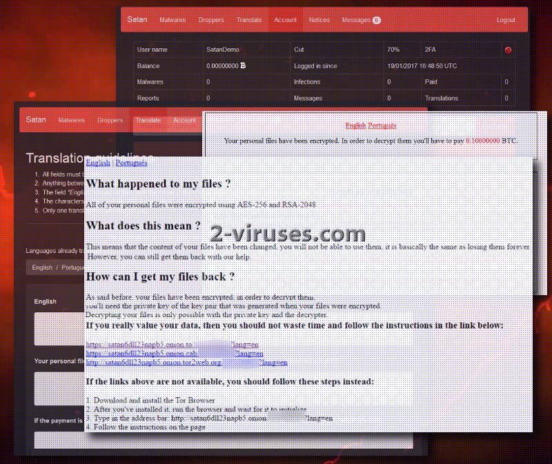 Janvier a pris un tour intéressant et effrayant quand de nouveaux virus ont commencé à apparaître. Hier, nos chercheurs étaient concernés par le virus complexe Spora qui a montré un haut niveau de cryptage et de résistance. Maintenant, sans avertissement préalable, nous devons introduire une nouvelle infection ransomware qui n’est certainement pas votre virus typique. Cette fois la ruse des pirates a décidé de profiter de l’aide de programmeurs amateurs à concevoir de nouveaux virus ransomware. Une facilité qui offre une telle assistance a été remarqué pour être réalisée sur des sites secrets qui sont des endroits populaires de discussions pour les personnes, intéressées par le piratage. Maintenant, si une personne formule une idée pour un virus, mais ne possède pas les capacités pour construire une telle menace, il peut utiliser les ressources qui ont fournies le service du ransomware Satan. Ce ransomware à livraison rapide exige de vous inscrire sur leur site. Étonnamment, ce service n’a pas de frais, mais si les utilisateurs enregistrés en tirent profit, un certain pourcentage de celui-ci va appartenir aux fondateurs du service du ransomware Satan. Les utilisateurs pourront obtenir 70% de leur premier bénéfice, mais plus de revenus ils apportent, plus ce pourcentage va croître.